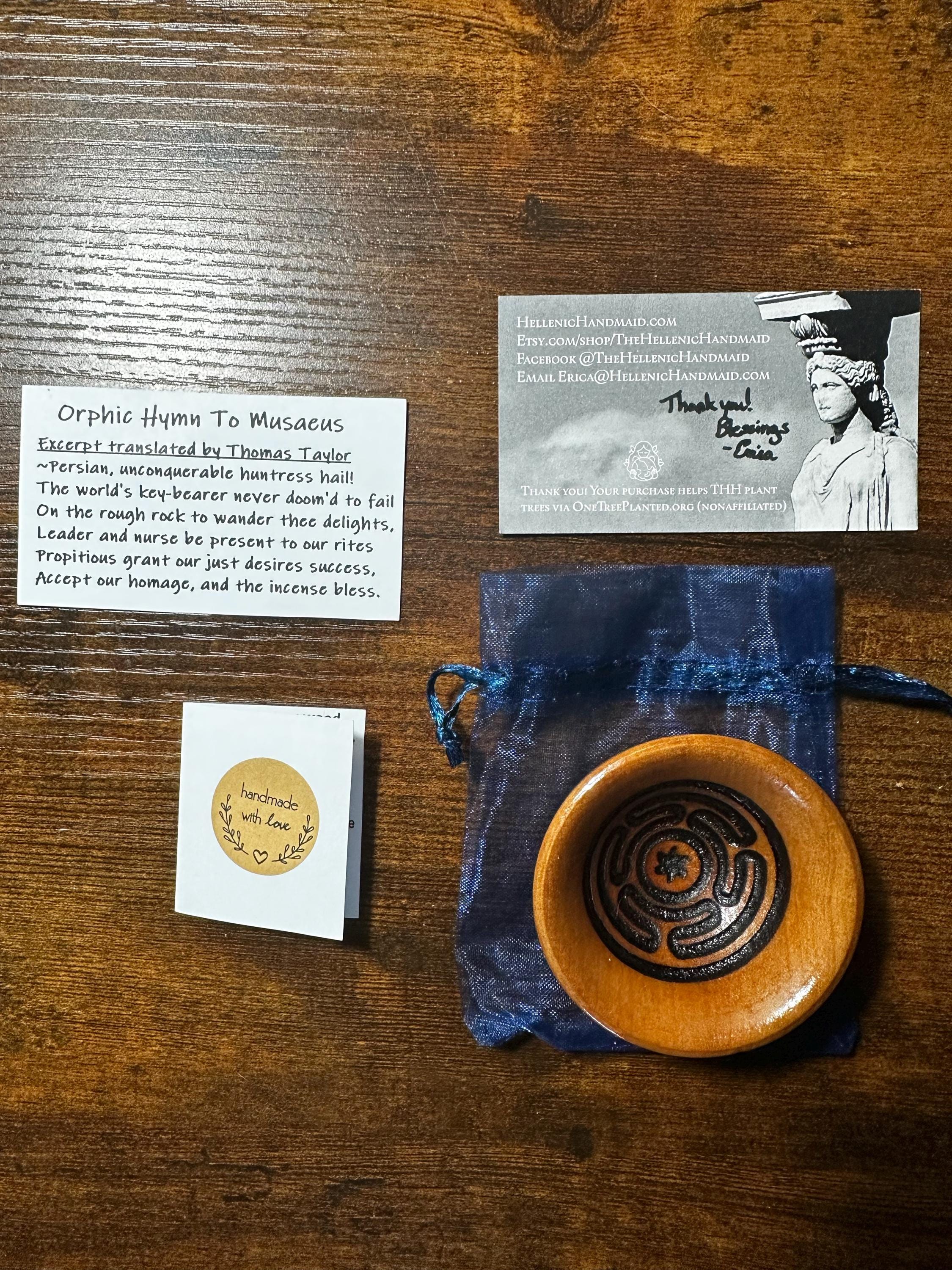 I’ve ordered here quite a bit, and as usual this one is also wonderful! The bowl has a nice color and the symbol engraved looks striking with the light wood and dark symbol contrasting nicely I love the way you package these with such care. The items look very safe with the paper padding inside. And the little paper with excerpts of classical hymns are always great to see. all in all a great order! I can’t wait to offer something in this for the lovely and great torch-bearing Hekate, I’m sure she’ll love it ^_^ Thank you so very much!